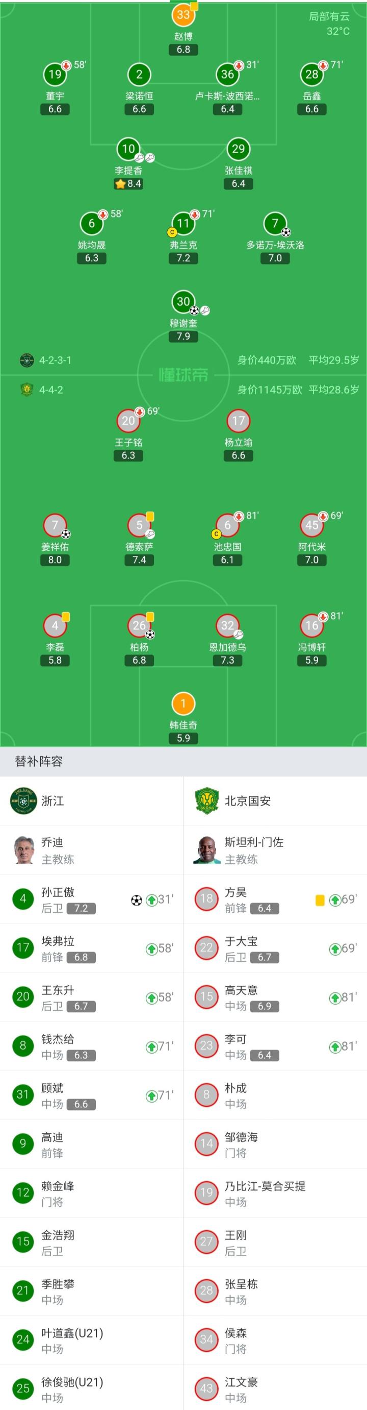 浙江首发:33-赵博、36-卢卡斯(31'4-孙正傲)、29-张佳祺、2-梁诺恒、19-董宇(58'20-王东升)、10-李提香、11-弗兰克(71'8-钱杰给)、6-姚均晟(58'17-埃弗拉)、28-岳鑫(71'31-顾斌)、7-埃沃洛、30-穆谢奎