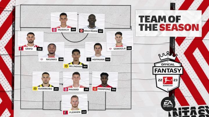 扫描下载懂球帝首页>动态> 德甲官方赛季最佳阵容:贝林厄姆领衔,恩昆库、穆西亚拉在列