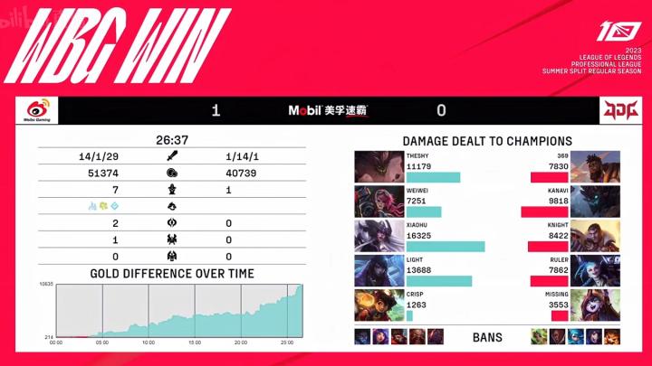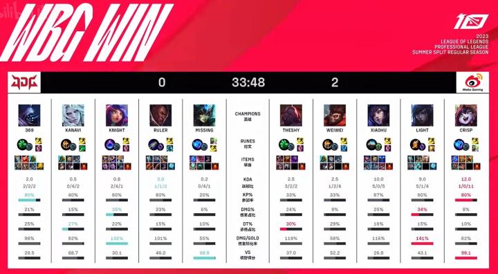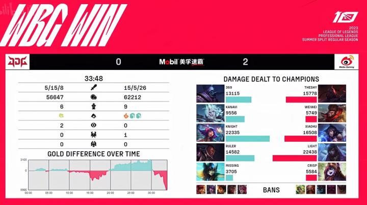 英雄联盟2023LPL夏季赛WBG vs JDG,WBG 2-0 JDG,WBG连下两局战胜MSI冠军JDG。