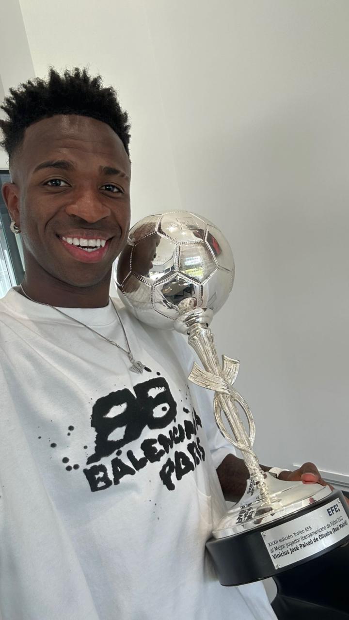 扫描下载懂球帝首页>动态> 实至名归!维尼修斯领取2022年度西甲最佳拉美球员奖杯