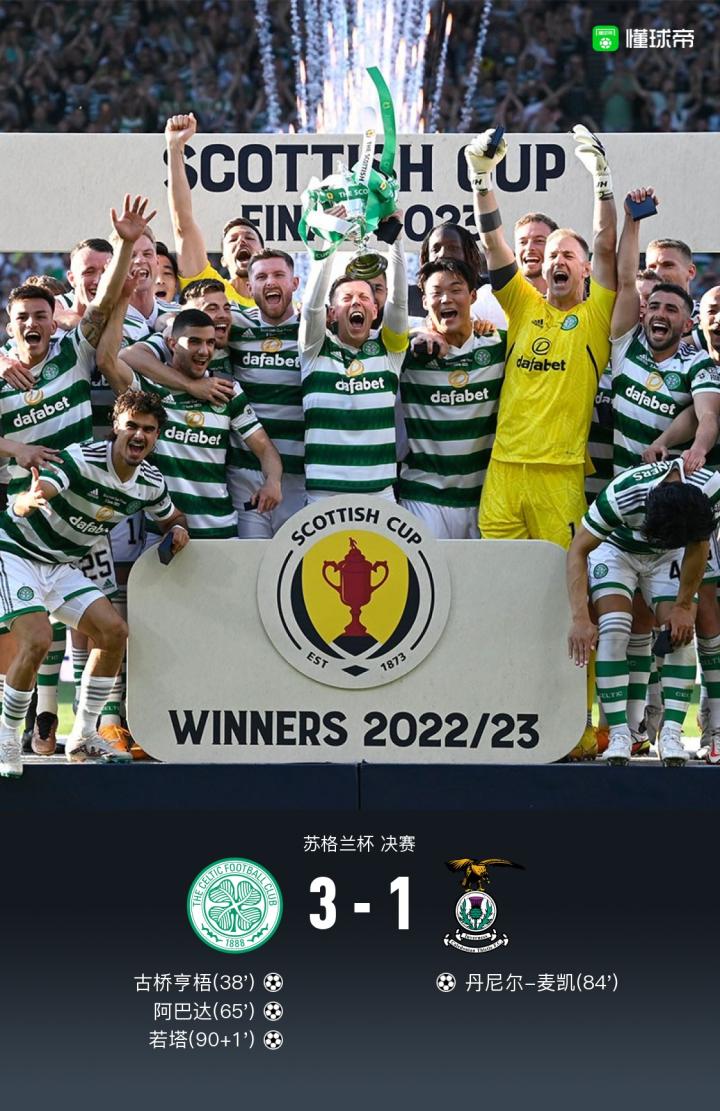 北京时间6月4日0:30,苏格兰杯决赛,凯尔特人对阵因弗内斯。上半场比赛,奥赖利助攻古桥亨梧破门得分;下半场,麦克格雷戈助攻阿巴达再下一城,丹尼尔-麦凯扳回一球,若塔补时破门锁定胜局。最终凯尔特人3-1战胜因弗内斯夺冠。