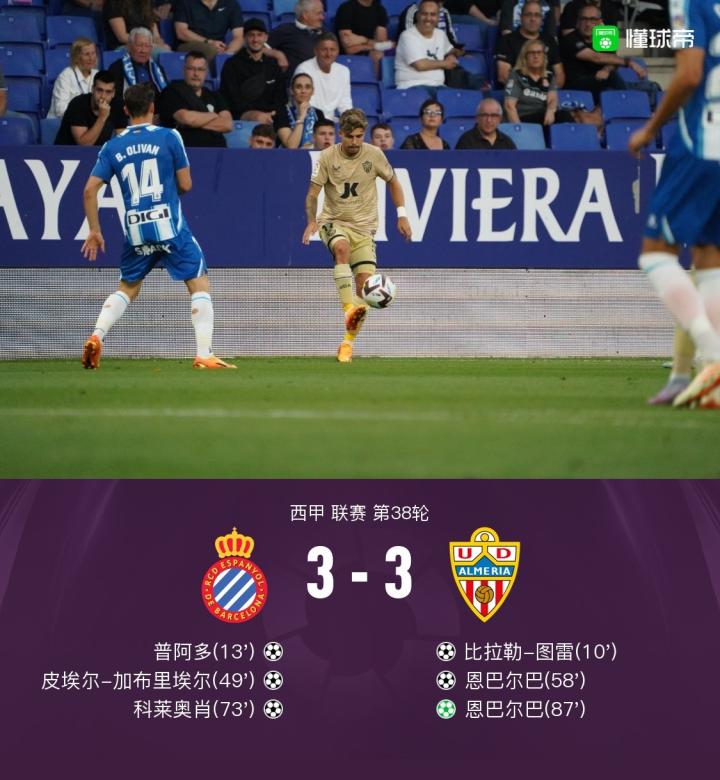 扫描下载懂球帝首页>动态> 阿尔梅里亚3-3西班牙人成功保级,恩巴尔巴战旧主梅开二度