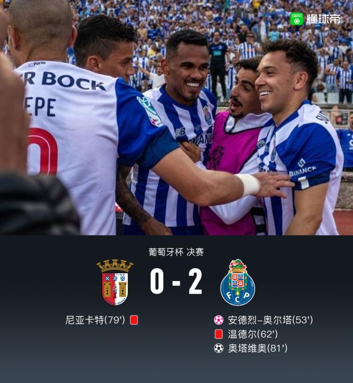 北京时间6月5日0:15,葡萄牙杯决赛展开较量,布拉加对阵波尔图。上半场乌里韦头球击中门框,下半场安德烈-奥尔塔门前自摆乌龙,之后温德尔、尼亚卡特犯规被裁判直红罚下,随后加莱诺助攻奥塔维奥破门扩大比分。全场结束,波尔图2-0战胜布拉加斩获葡萄牙杯两连冠。
