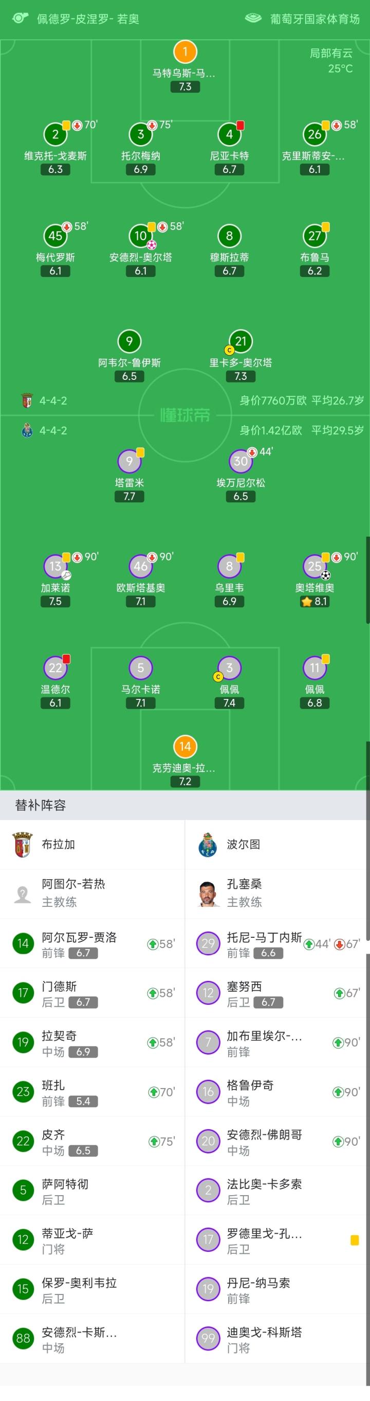 布拉加首发:1-马特乌斯-马加良斯、2-维克托-戈麦斯(70′23-班扎)、4-尼亚卡特、3-托尔梅纳(75′22-皮齐)、26-克里斯蒂安-博尔哈(58′17-门德斯)、10-安德烈-奥尔塔、45-梅代罗斯(58′14-阿尔瓦罗-贾洛)、8-穆斯拉蒂、27-布鲁马、9-阿韦尔-鲁伊斯、21-里卡多-奥尔塔(58′19-拉契奇)