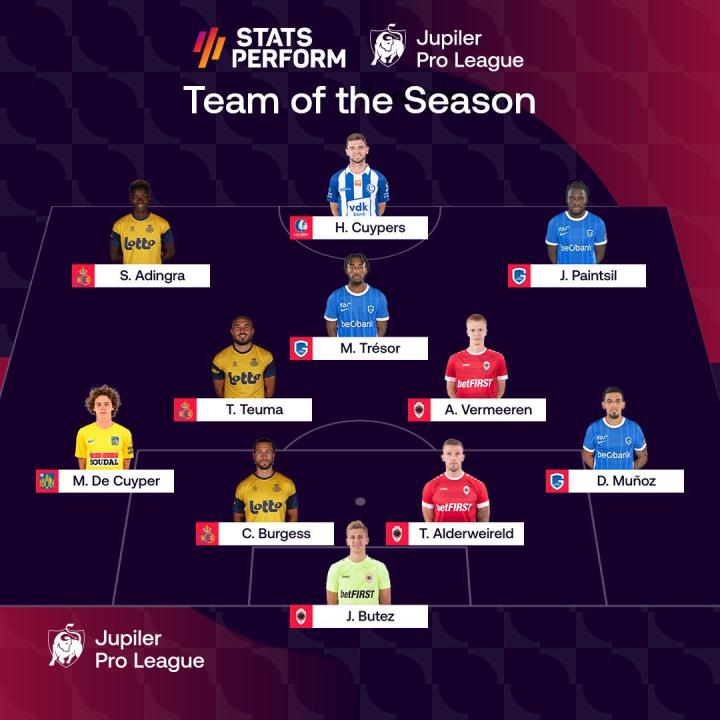 根据OPTA基于比甲整个赛季统计数据组建的最佳阵容出炉,安特卫普、亨克、圣吉罗斯各有3名球员入选,比甲金靴屈佩尔、韦斯特洛左后卫德克伊珀在列