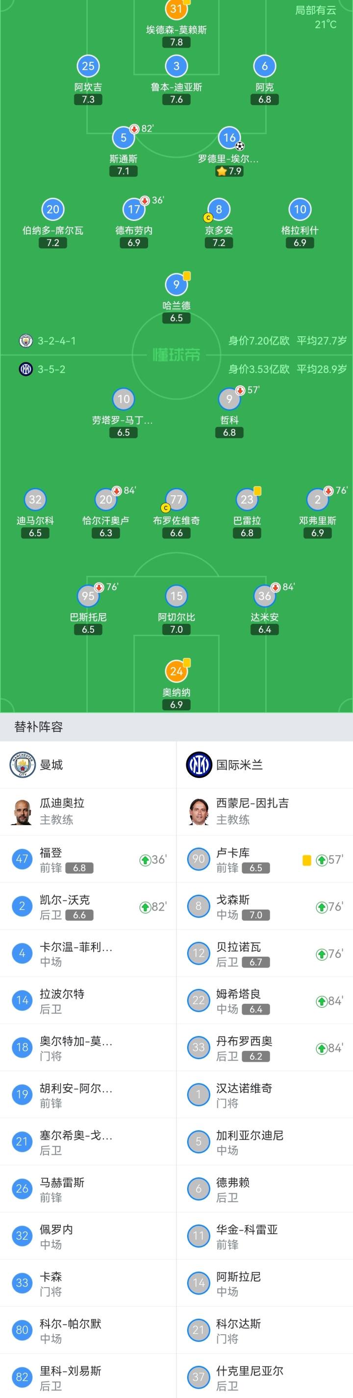 曼城首发:31-埃德森-莫赖斯、25-阿坎吉、3-鲁本-迪亚斯、6-阿克、5-斯通斯(82'2-凯尔-沃克)、16-罗德里-埃尔南德斯、8-京多安、17-德布劳内(36'47-福登)、20-伯纳多-席尔瓦、10-格拉利什、9-哈兰德