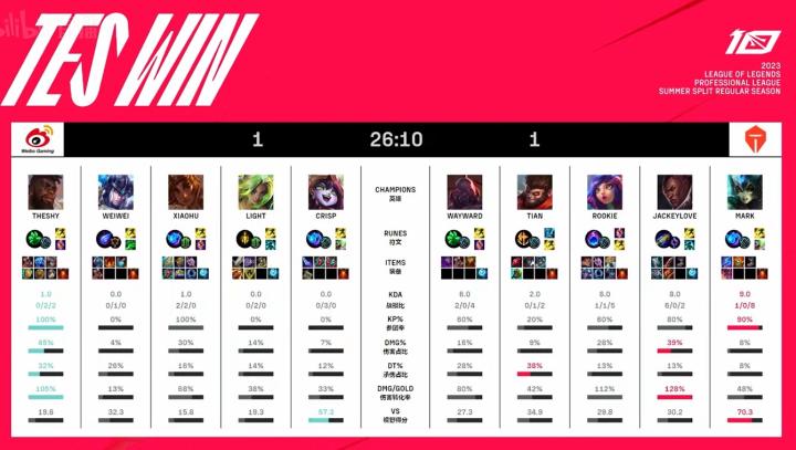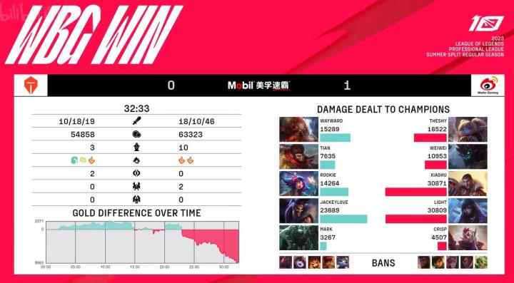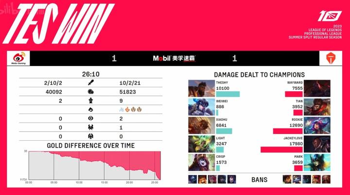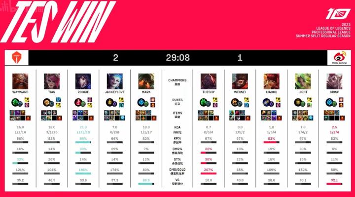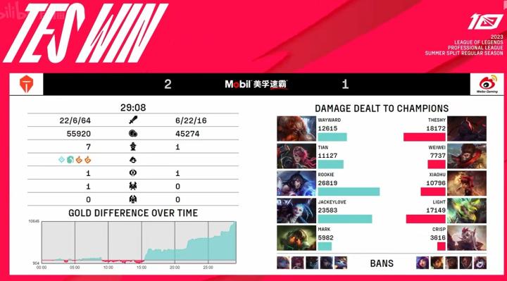 英雄联盟2023LPL夏季赛TES vs WBG,TES 2-1 WBG,TES完美团战完成让一追二。