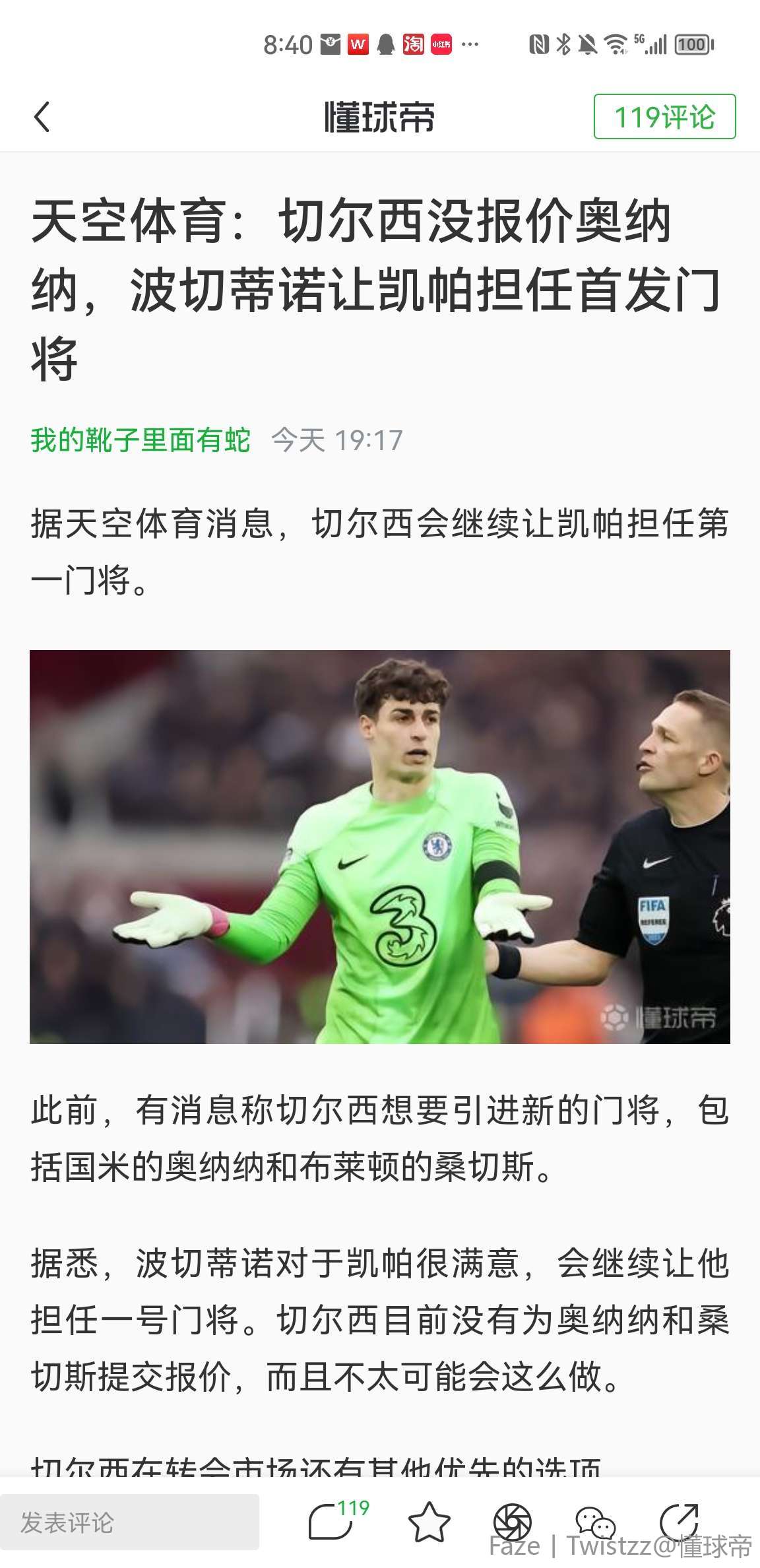 扫描下载懂球帝首页>动态> 镜报:切尔西将和国米谈奥纳纳,有四名球员可能被加入交易