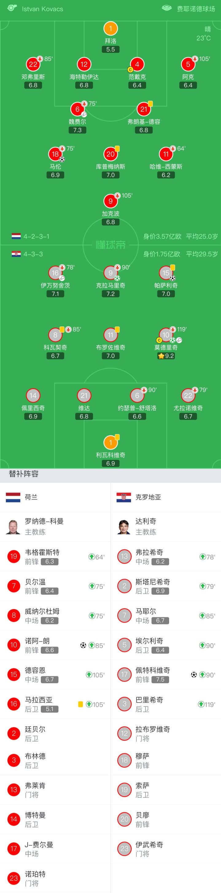 荷兰首发:1-比尔罗、22-邓弗里斯(85'10-诺阿-朗)、12-海特勒伊达、4-范戴克、5-阿克(105'16-马拉西亚)、6-魏费尔(75'8-威纳尔杜姆)、20-库普梅纳斯、21-弗朗基-德容、18-马伦(75'7-贝尔温)、9-加克波(105'15-德容恩)、11-哈维-西蒙斯(46'19-韦格霍斯特)