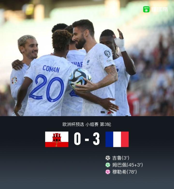 北京时间6月17日02:45,欧洲杯预选赛小组赛B组第3轮,法国作客葡萄牙的阿尔加夫球场对阵直布罗陀,本场主裁判为阿拉诺夫斯基。上半场,科曼助攻吉鲁头槌闪击,姆巴佩造点并亲自操刀命中。下半场,姆巴佩造穆勒希乌龙;楚阿梅尼、格列兹曼、迪萨西三人本场共四度击中门框。最终,法国客场3-0击败直布罗陀。