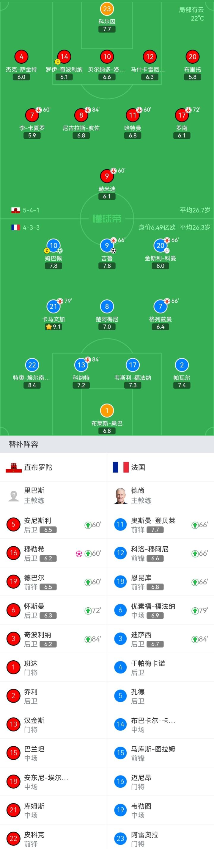 法国首发:1-布莱斯-桑巴、2-帕瓦尔、13-科纳特(85'3-迪萨西)、17-韦斯利-福法纳、22-特奥-埃尔南德斯、21-卡马文加(79'6-优素福-福法纳)、8-楚阿梅尼、7-格列兹曼(66'18-恩昆库)、20-金斯利-科曼(66'11-奥斯曼-登贝莱)、10-姆巴佩、9-吉鲁(66'12-科洛-穆阿尼)