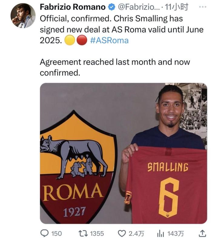扫描下载懂球帝首页>动态> 懂球号> 33岁的斯莫林,罗马官方确认。签了一份新合同,有...