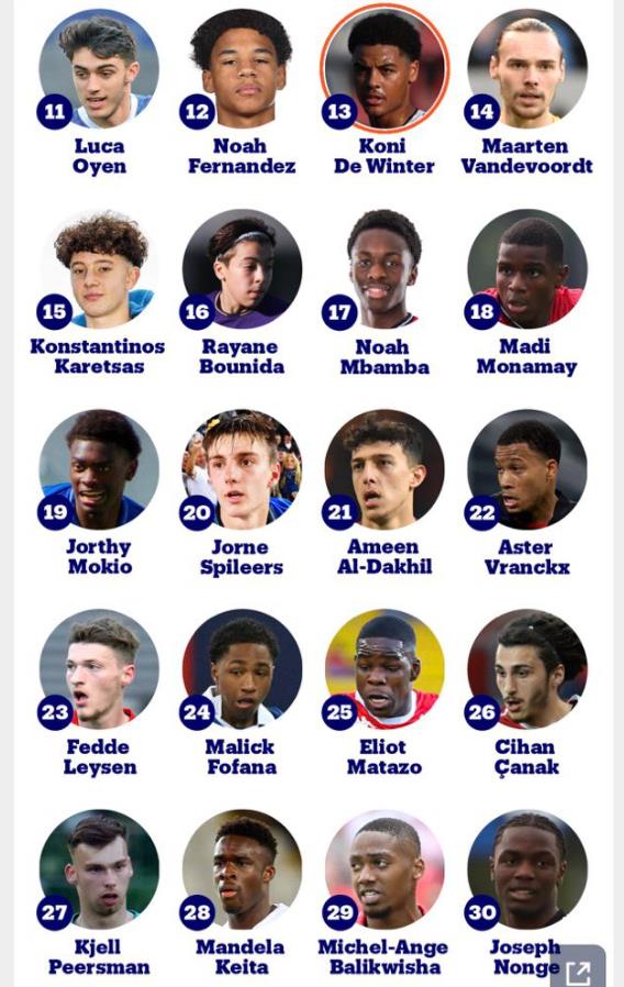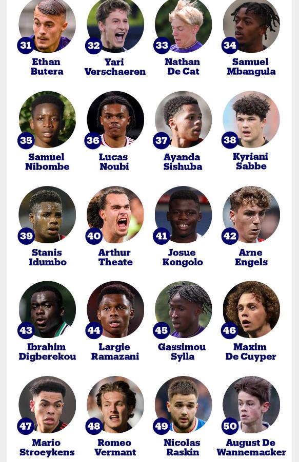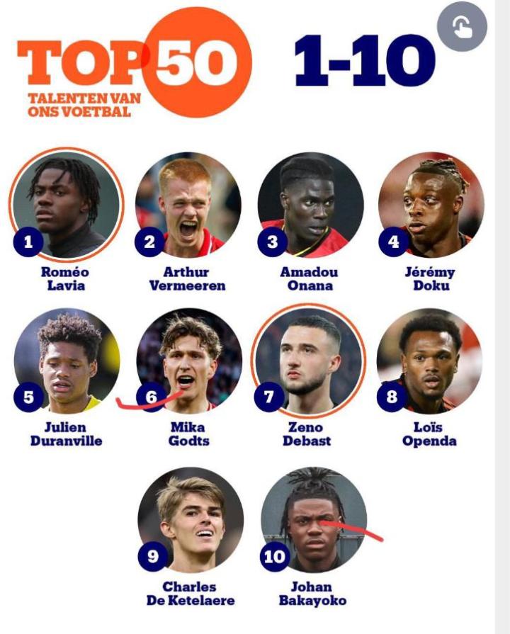比利时媒体Nieuwsblad_be评选出本土00年到08年出生的50大新星排名,拉维亚、费尔梅伦、奥纳纳位列前三