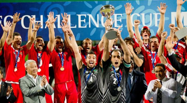 (图)巴勒斯坦队长萨利赫举起亚足联挑战者杯奖杯