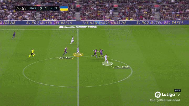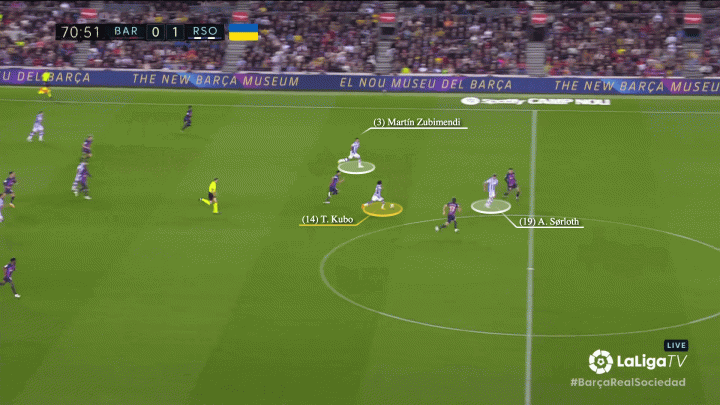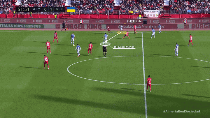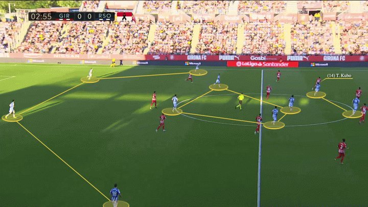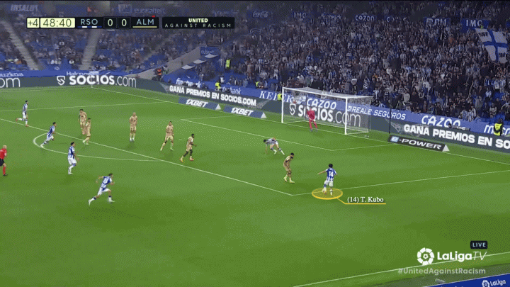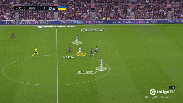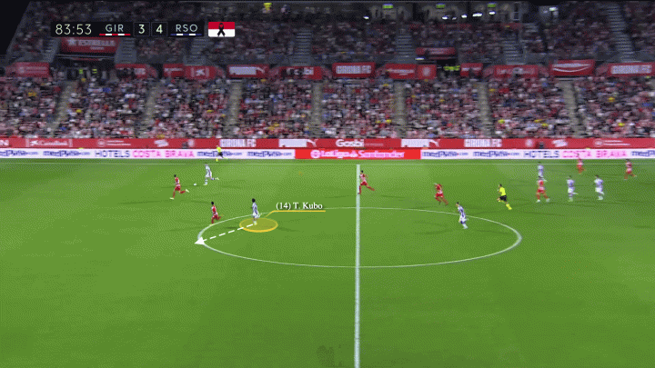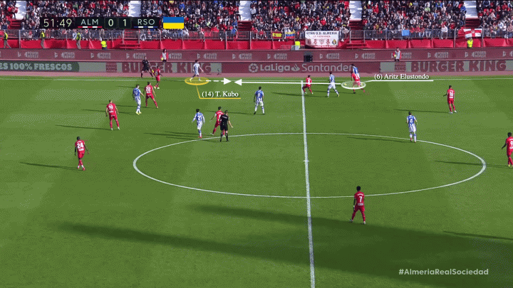 久保建英不总是顶在最前方,他也非常善于在前场游弋或者回援中场。下图中,他来到右侧,接应埃卢斯通多的传球。