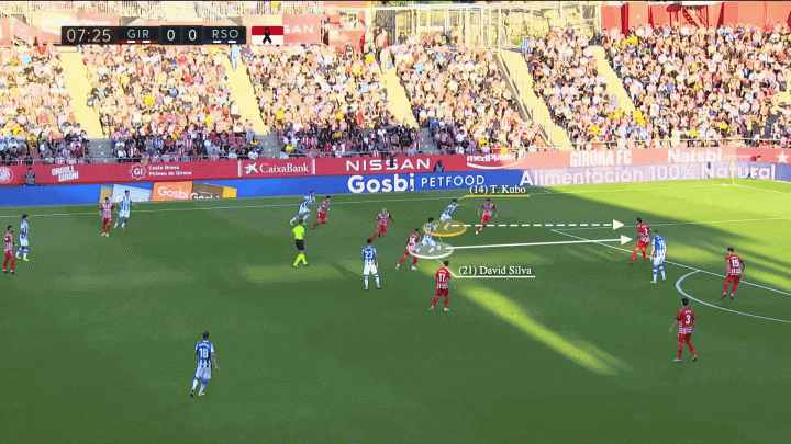 在10月客场5-3战胜赫罗纳的比赛中,大卫-席尔瓦发现了久保建英的跑动路线。
