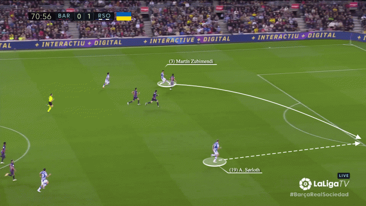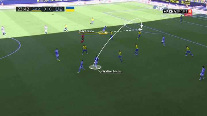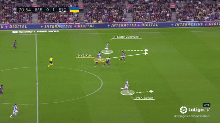在3月19日皇家社会对阵埃尔切的比赛里,久保建英在对方后边后卫莫伦特身后示意要球,但皇家社会中场核心马丁-苏维门迪选择了更稳妥的传球方式。