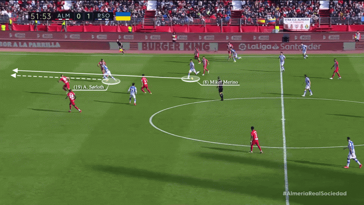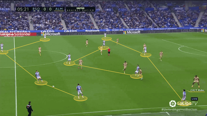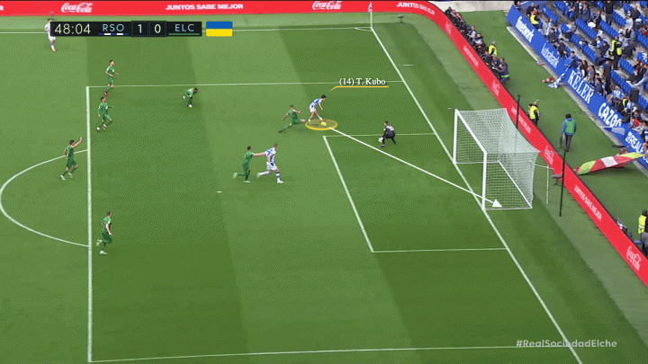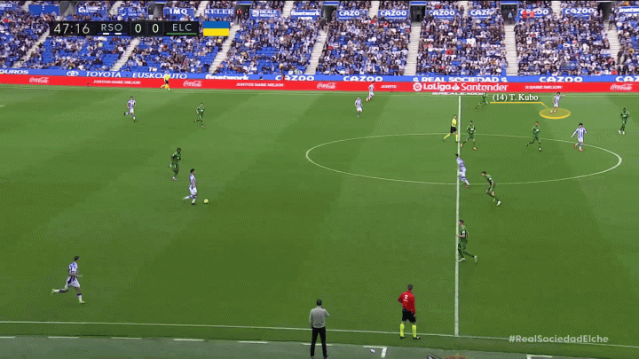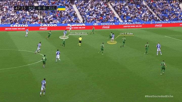短短几秒钟后,皇家社会在对方两条线之间找到了大卫-席尔瓦,久保建英调整了位置,来到了埃尔切右边卫和右中卫之间的区域。
