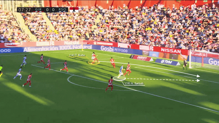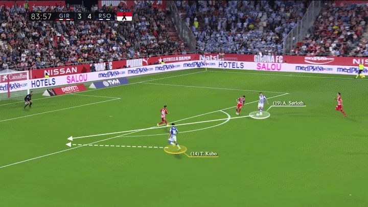 作为双前锋之一,久保建英在对方身后的无球跑动和速度使他成为了对方防守三区的心腹大患,尤其当大卫-席尔瓦在场时,皇家社会的进攻总是招招致命。