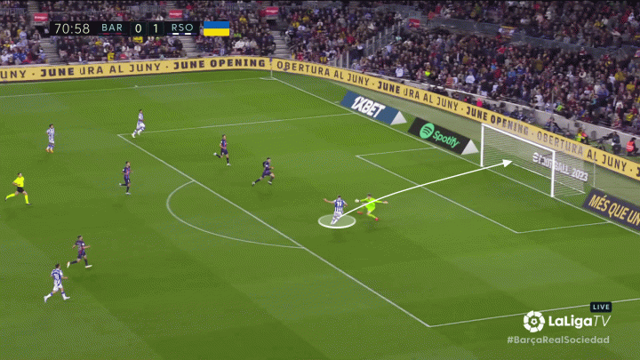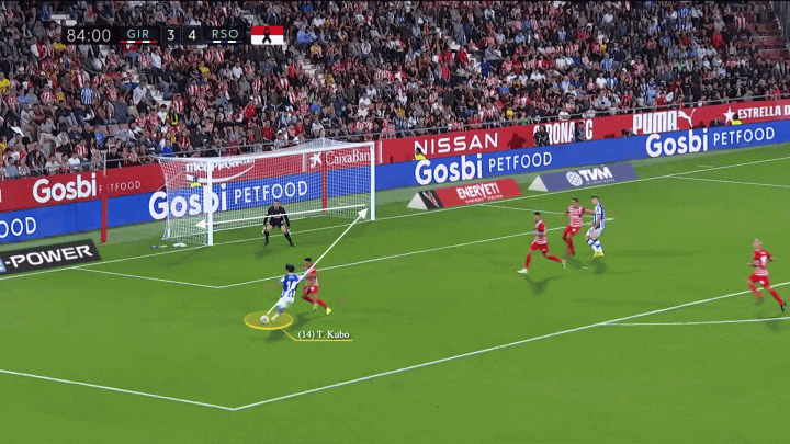 在攻防转换时,久保建英的速度和盘带与他果断的决策能力相辅相成。他对场上局势的洞察帮助他总能做出最快最好的决定,就像5月20日客场对阵巴萨攻入的那粒进球一样。