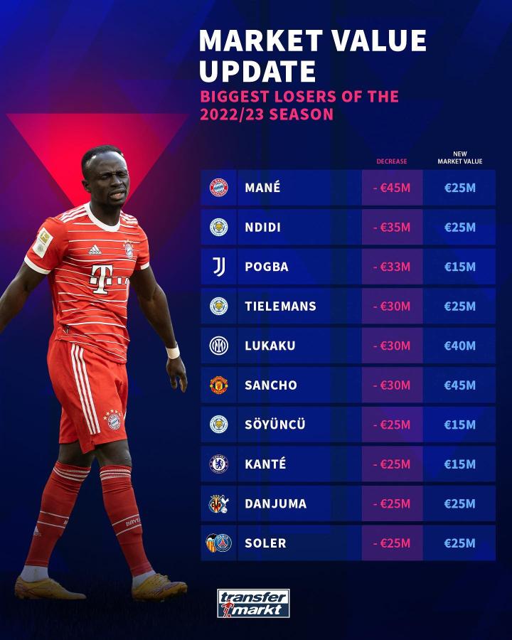扫描下载懂球帝首页>动态> 懂球号> 2022-23赛季德转身价下跌榜马内下跌4500...