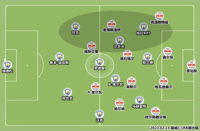 作为能够胜任七个位置的多面手,索博斯洛伊在国家队有过担任两翼边锋(343)的经历,在俱乐部时期主要担任右前卫(442/4222)和前腰(4231)。面对控球能力极强的曼城,RB莱比锡选择了“中位”压迫,四名中场既要向前施压持球人,又要及时回收保护后卫,以超额输出支撑防守体系。索博斯洛伊表现地非常勤勉,既能顶到锋线施压,也可以待对手进入“中场”区域后再实施逼抢,退守禁区后还敢于做动作。