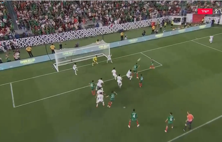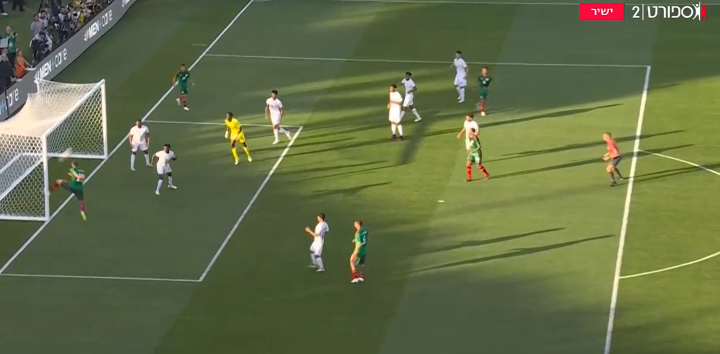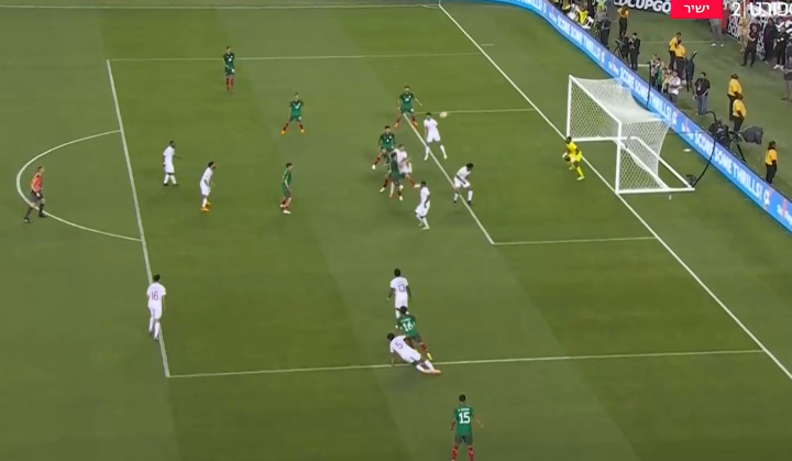 墨西哥左侧角球再开出,莱内兹禁区右侧起高球,伊斯雷尔·雷耶斯头球,球也偏出远端立柱!