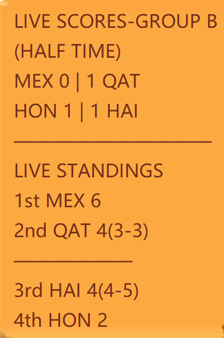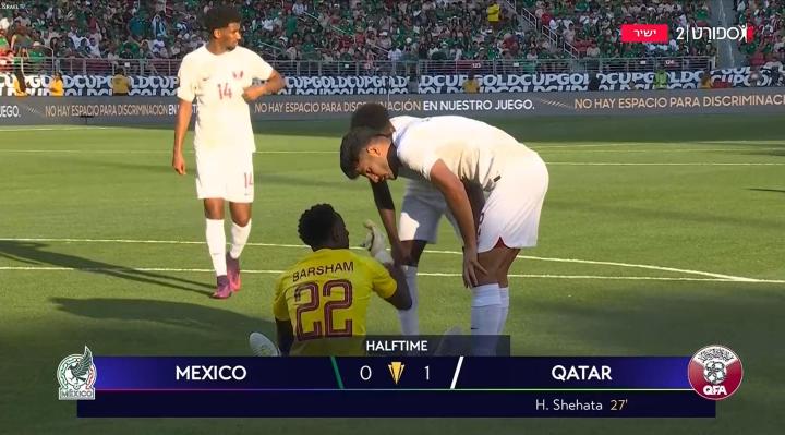 上半场比赛结束,卡塔尔带着1:0的领先优势回到更衣室。由于另一场比赛海地暂时与洪都拉斯打成1:1平,实时积分榜上卡塔尔排在第二,墨西哥头名不变。墨西哥控球率72%,卡塔尔只有1脚射门,墨西哥7脚射门3脚射正。卡塔尔13次犯规,而墨西哥是5次。