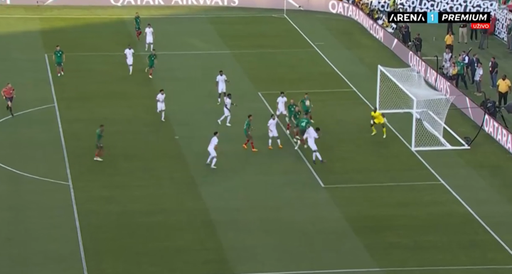 第27分钟,卡塔尔在右路突破墨西哥球员封锁,一脚精准直塞找到13号赫德尔,后者送出传中,3号谢哈塔头槌,奥乔亚碰到了球但没有阻止球入网。卡塔尔1:0领先墨西哥!