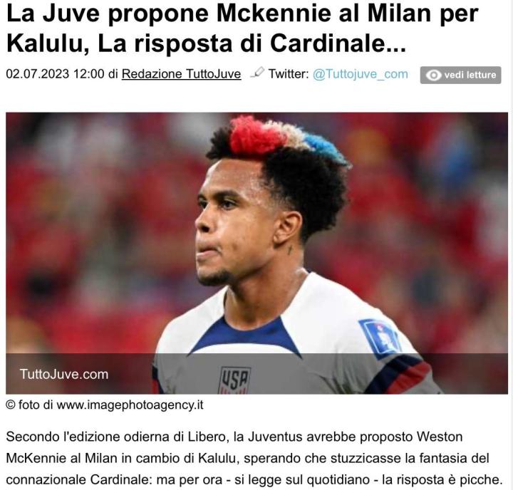 扫描下载懂球帝首页>动态> 懂球号> Libero:尤文提议用麦肯尼交换卡卢卢,但米兰...