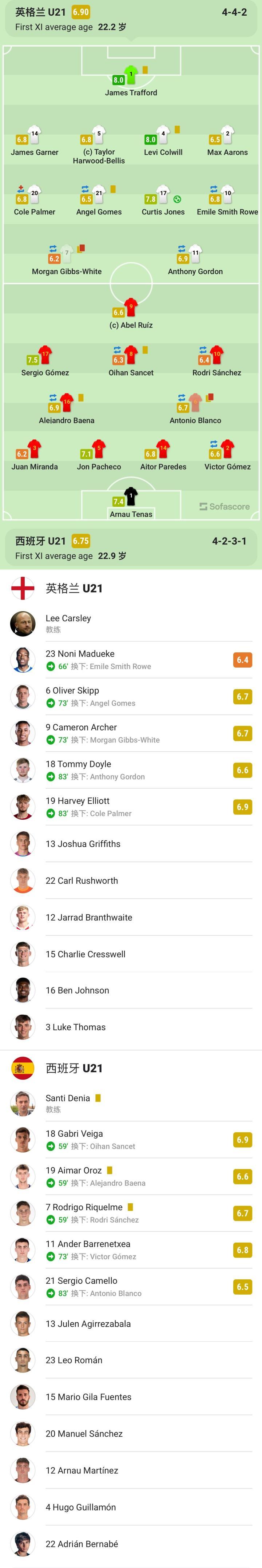 英格兰U21首发:1-特拉福德、14-詹姆斯-加纳、5-哈伍德-贝利斯、4-科尔威尔、2-阿伦斯、17-柯蒂斯-琼斯、20-帕尔默(83'19-埃利奥特)、21-安赫尔-戈麦斯(73'6-斯基普)、7-吉布斯-怀特(73'9-阿彻)、11-安东尼-戈登(83'18-汤米-多伊尔)、10-史密斯-罗(66'23-马杜埃凯)