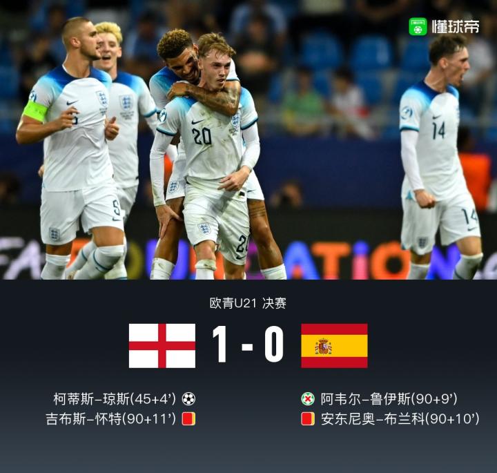 北京时间7月9日00:00, 欧青U21决赛英格兰对阵西班牙。上半场,巴埃纳远射打偏,罗德里-桑切斯抽射偏出,科尔威尔头球击中门框,帕尔默任意球打在琼斯身上折射入网。下半场,阿韦尔-鲁伊斯进球被吹,罗德里戈-里克尔梅劲射打偏,阿韦尔-鲁伊斯补时阶段点球被特拉福德扑出,吉布斯-怀特和安东尼奥-布兰科染红,最终,英格兰1-0西班牙第三次夺得U21欧青赛冠军!