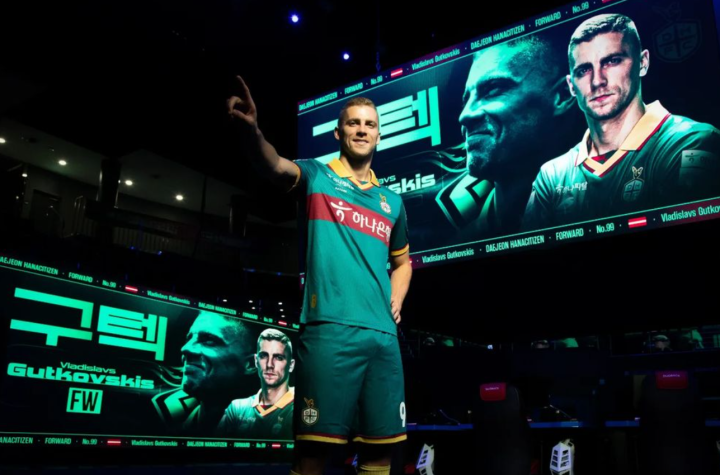 大田终于官宣了这个名字里带KISS的拉脱维亚国脚前锋。 之前刚有转会传闻的时候,大田球迷就给他起了外号:“啵啵前锋”,“亲嘴前锋”。 根据球员要求,他在K联赛的注册名会沿用其在波兰联赛效力时的古泰克(구텍)。