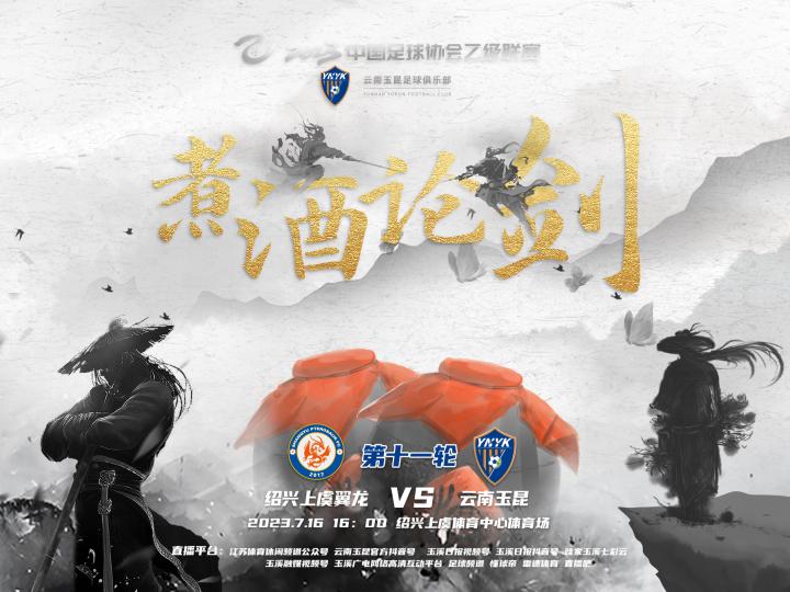 2023年7月16日16:00,2023中乙联赛第十一轮,云南玉昆将做客挑战绍兴上虞翼龙;目前绍兴上虞翼龙3胜1平6负排名中乙南区第六,云南玉昆5胜2平3负排名中乙南区第三;