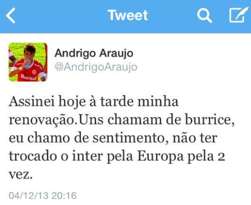 但安德里戈是个重情重义之人,他知道此时出走对巴西国际来说是个多么大的一笔损失,因此他选择留守,等待下一次留洋的机会。“我想要做好准备再出国,在熟悉的环境中成长会更有效率。我在国际队效力了很多年,我非常尊重俱乐部,所以我决定留下来。”