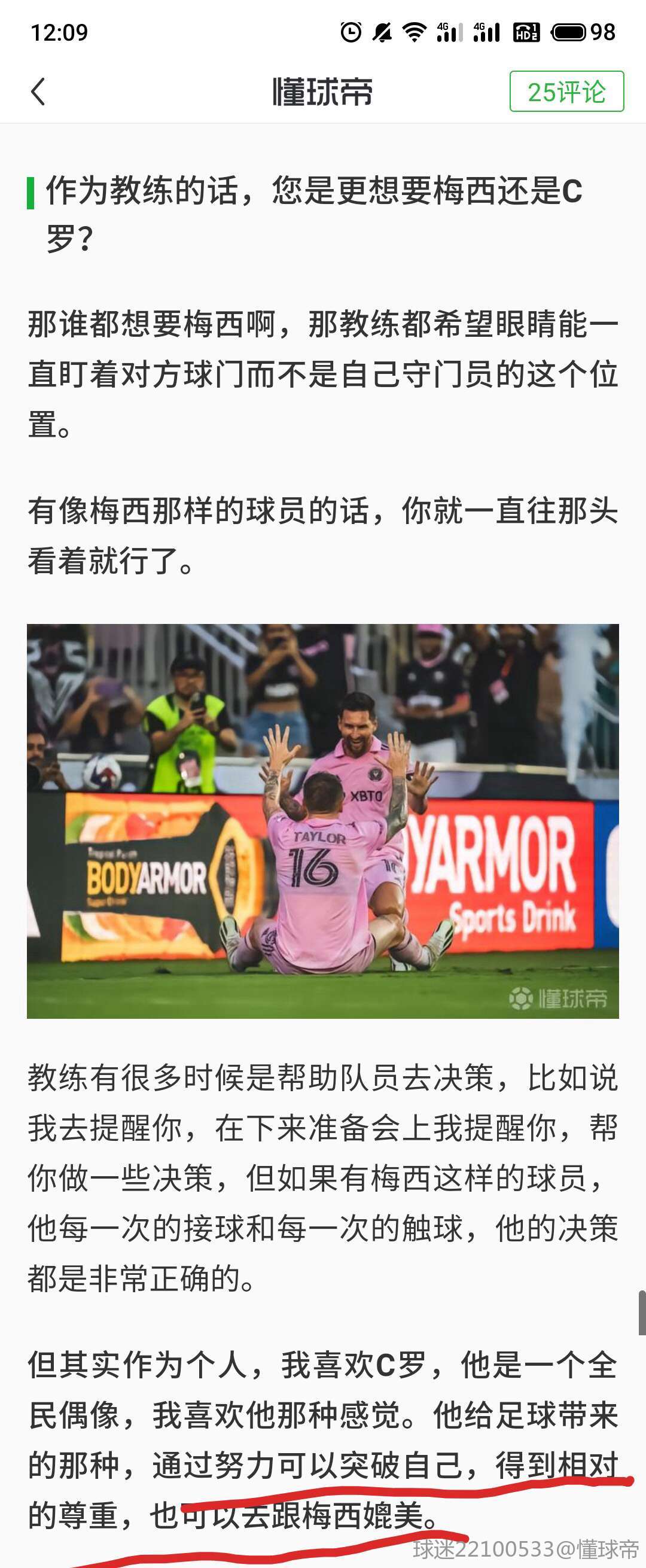 但其实作为个人,我喜欢C罗,他是一个全民偶像,我喜欢他那种感觉。他给足球带来的那种,通过努力可以突破自己,得到相对的尊重,也可以去跟梅西媲美。