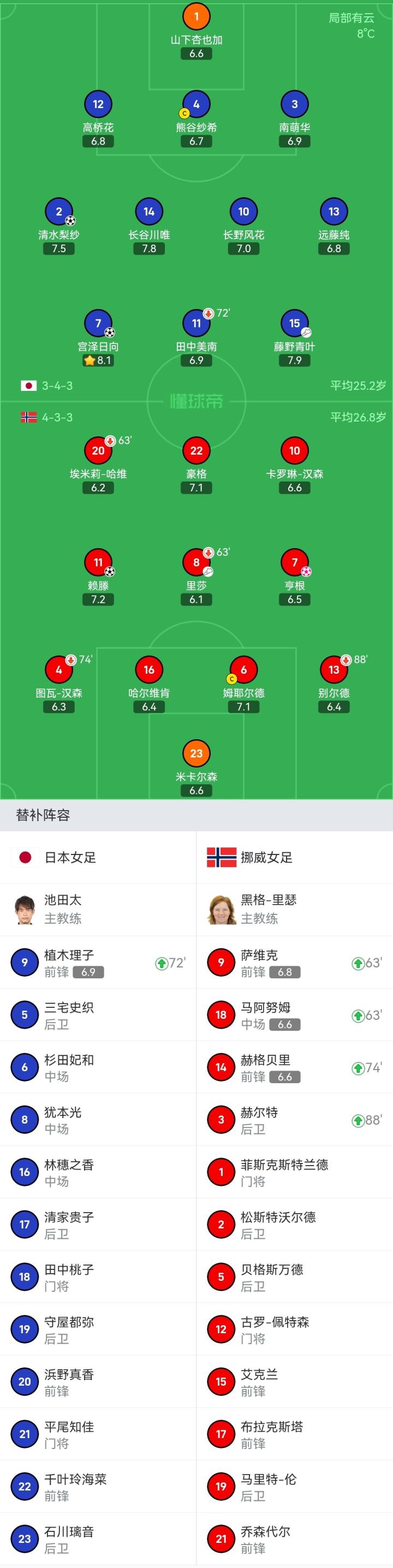 挪威女足首发:23-米卡尔森、13-别尔德(88'3-赫尔特)、6-姆耶尔德、16-哈尔维肯、4-图瓦-汉森(74'14-赫格贝里)、8-里莎(65'18-马阿努姆)、7-亨根、11-赖滕、10-卡罗琳-汉森、20-埃米莉-哈维(63'9-萨维克)、22-豪格
