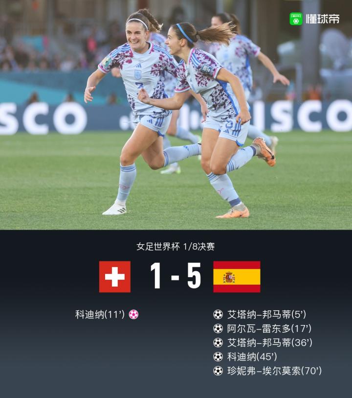 北京时间8月5日13:00,2023女足世界杯1/8决赛,瑞士女足对阵西班牙女足。上半场,刚开场西班牙就制造威胁,邦马蒂补射打破僵局,随后科迪纳超级巨大失误乌龙送礼、瑞士扳平比分,然而西班牙女足此后连续在禁区内制造威胁,雷东多帮助西班牙再次领先,邦马蒂完成梅开二度,科迪纳将功补过在乱战中破门;下半场,西班牙仍然占据绝对优势,埃尔莫索破门,最终西班牙5-1瑞士轻松晋级八强。