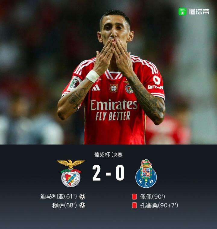北京时间8月10日,本菲卡在葡萄牙超级杯决赛中对阵波尔图。迪马利亚和穆萨在半场先后为本菲卡取得进球,佩佩在比赛尾声被直红罚下,补时阶段加莱诺打进世界波但因博尔热斯手球在先被判无效,随后波尔图主帅孔塞桑因为不满裁判判罚也被罚下。最终本菲卡2-0击败波尔图,队史第九次获得葡萄牙超级杯冠军。