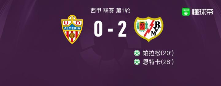 北京时间8月12日西甲 联赛 第1轮,阿尔梅里亚主场对阵巴列卡诺。巴列卡诺帕拉松破门,恩特卡破门。最终比分0-2。