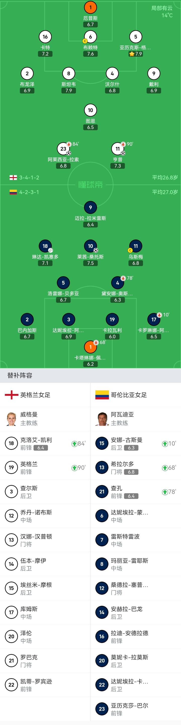 英格兰女足首发:1-厄普斯、5-亚历克斯-格林伍德、2-布龙泽、16-卡特、6-布赖特、4-沃尔什、8-斯坦韦、10-图恩、9-戴利、11-亨普(90+3'19-英格兰)、23-阿莱西亚-拉索(84'18-克洛艾-凯利)