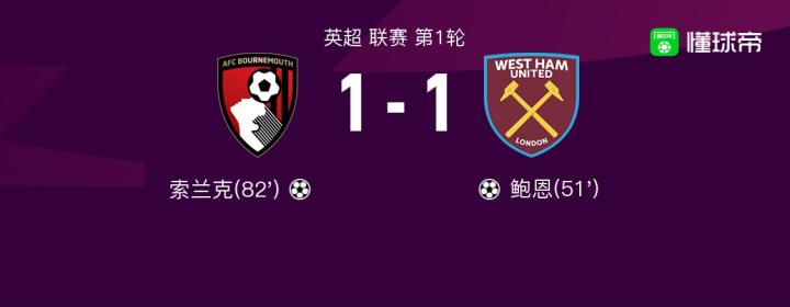 扫描下载懂球帝首页>动态> 伯恩茅斯1-1西汉姆联,索兰克,鲍恩破门