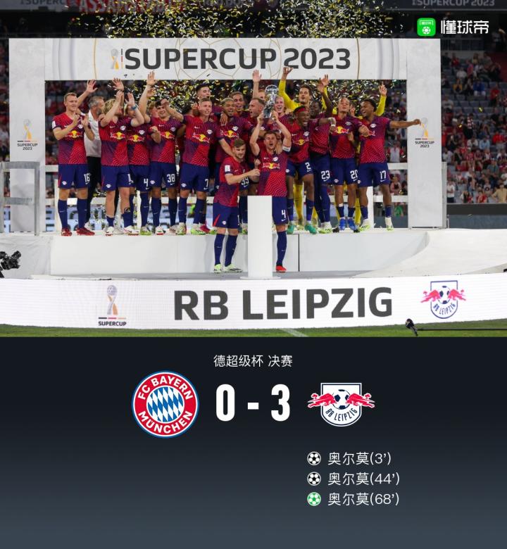 北京时间8月13日,拜仁慕尼黑在德国超级杯决赛主场对阵莱比锡。上半场奥尔莫开场3分钟便闪击得手为莱比锡首开记录,之后又在半场临近结束时再进一球上演梅开二度。下半场凯恩替补登场,在加盟仅一天后就迎来拜仁生涯首秀,随后马兹拉维禁区内手球送点,奥尔莫点射破门完成帽子戏法。最终莱比锡3-0击败拜仁慕尼黑,赢得新赛季德国超级杯冠军,而刚刚加盟拜仁的凯恩则仍然无缘获得自己职业生涯的第一座冠军奖杯。