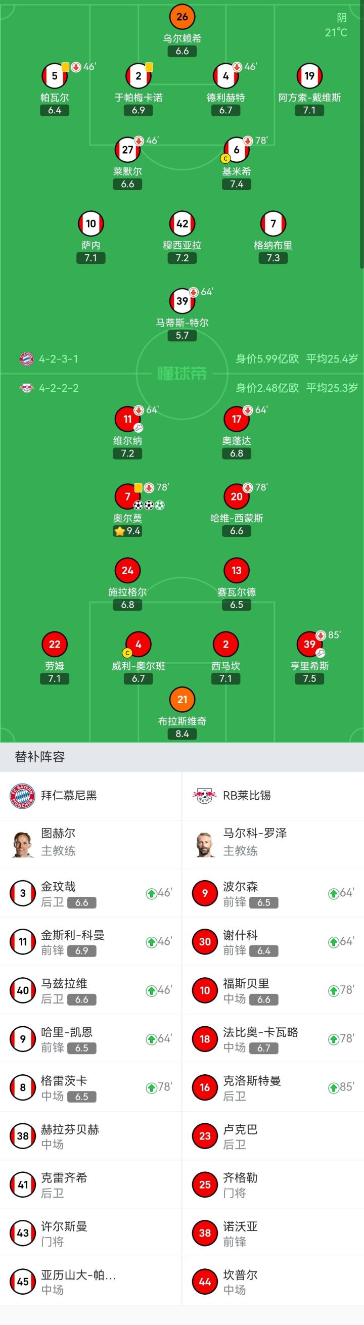 替换下场:64'维尔纳, 85'亨里希斯, 78'奥尔莫, 64'奥蓬达, 78'哈维-西蒙斯