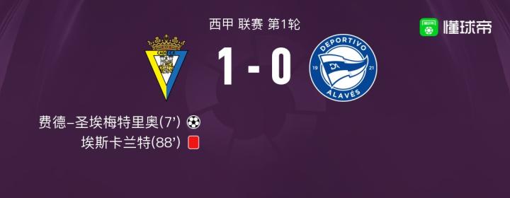 北京时间8月15日西甲 联赛 第1轮,加的斯主场对阵阿拉维斯。费德-圣埃梅特里奥在第7分钟头球破门,埃斯卡兰特第88分钟飞铲犯规被直红罚下。全场结束,加的斯1-0战胜阿拉维斯,取得开门红。