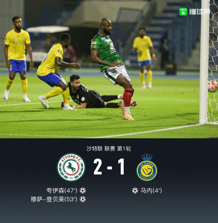 第4分钟,联赛第一球,马内首开记录,利雅得胜利1-0领先
