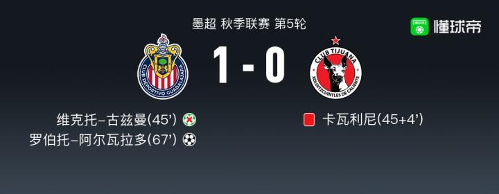 北京时间8月23日墨超 秋季联赛 第5轮,瓜达拉哈拉主场对阵蒂华纳。瓜达拉哈拉罗伯托-阿尔瓦拉多破门。最终比分1-0。