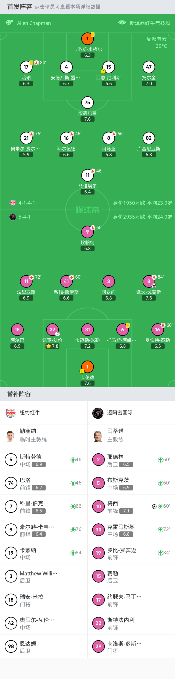 纽约红牛首发:1-米格尔、17-哈珀、4-雷耶斯、15-尼利斯、47-托尔金、21-奥米尔-费尔南德斯、8-阿马亚、75-埃德尔曼、16-耶尔伍德、82-卢基尼亚斯、11-马诺埃尔