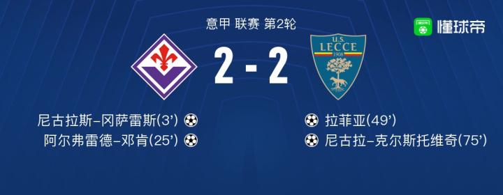 北京时间8月28日意甲 联赛 第2轮,佛罗伦萨主场对阵莱切。佛罗伦萨尼古拉斯-冈萨雷斯破门,阿尔弗雷德-邓肯破门。莱切拉菲亚破门,尼古拉-克尔斯托维奇破门。最终比分2-2。