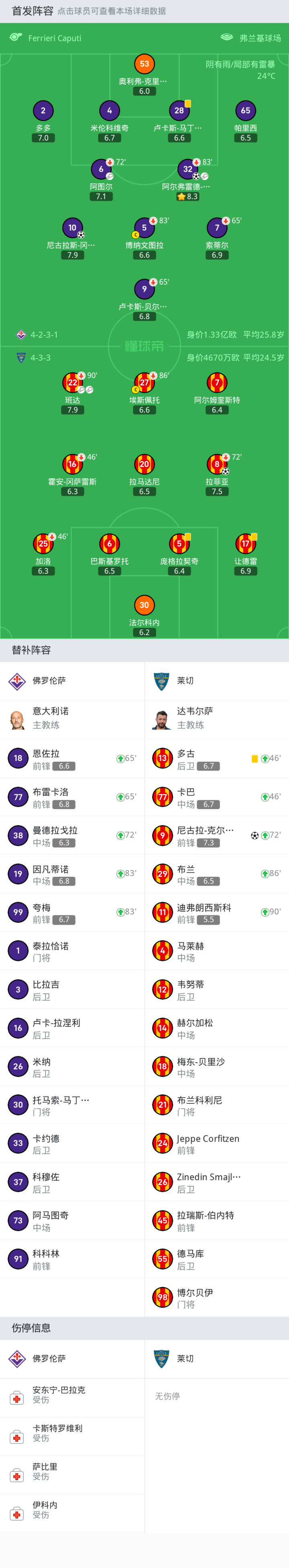 莱切首发:法尔科内, 拉马达尼, 巴斯基罗托, 庞格拉契奇, 拉菲亚, 阿尔姆奎斯特, 埃斯佩托, 班达, 加洛, 让德雷, 霍安-冈萨雷斯